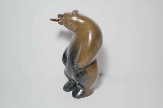 Brown and Black Jasper Bear holding a fish Carving