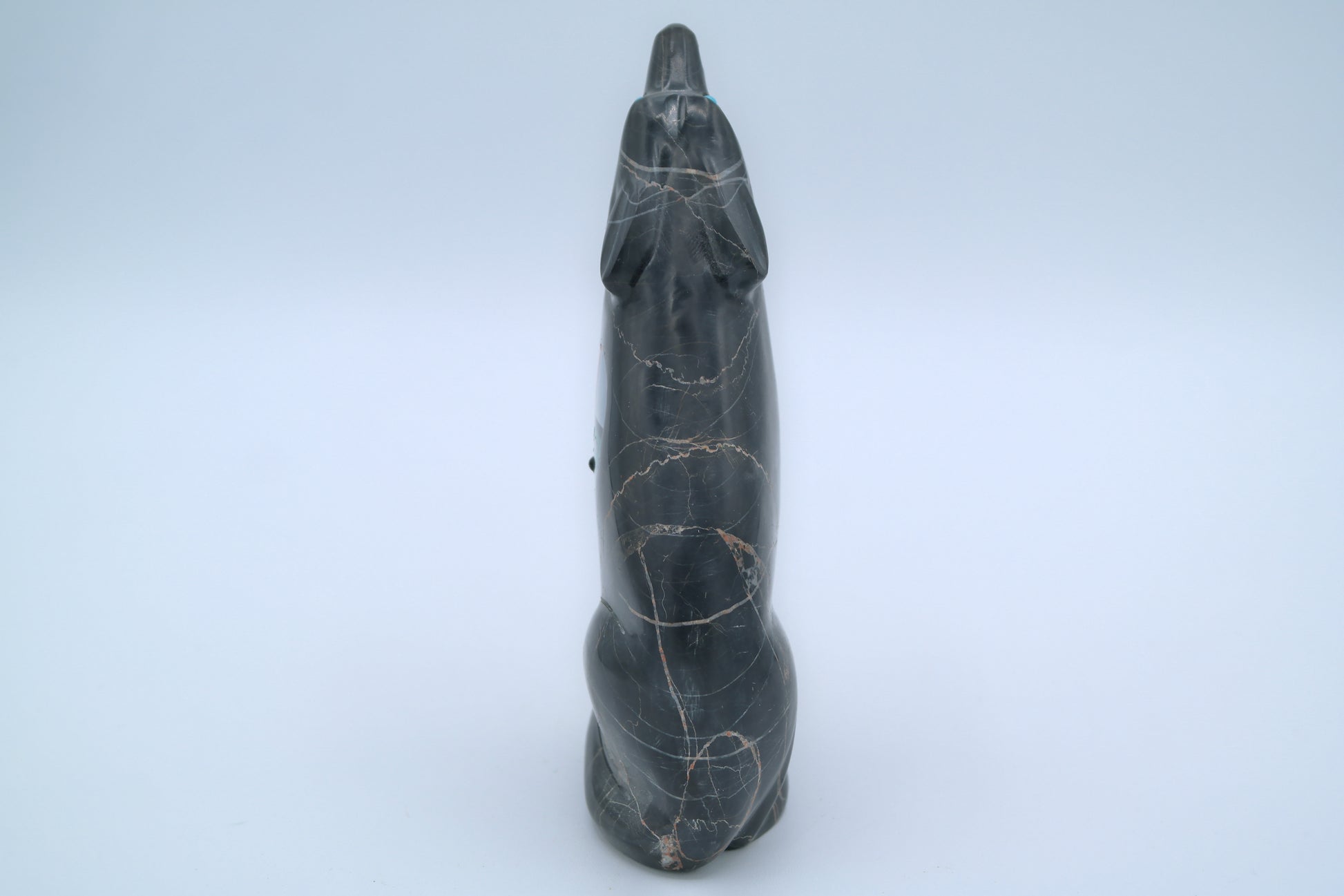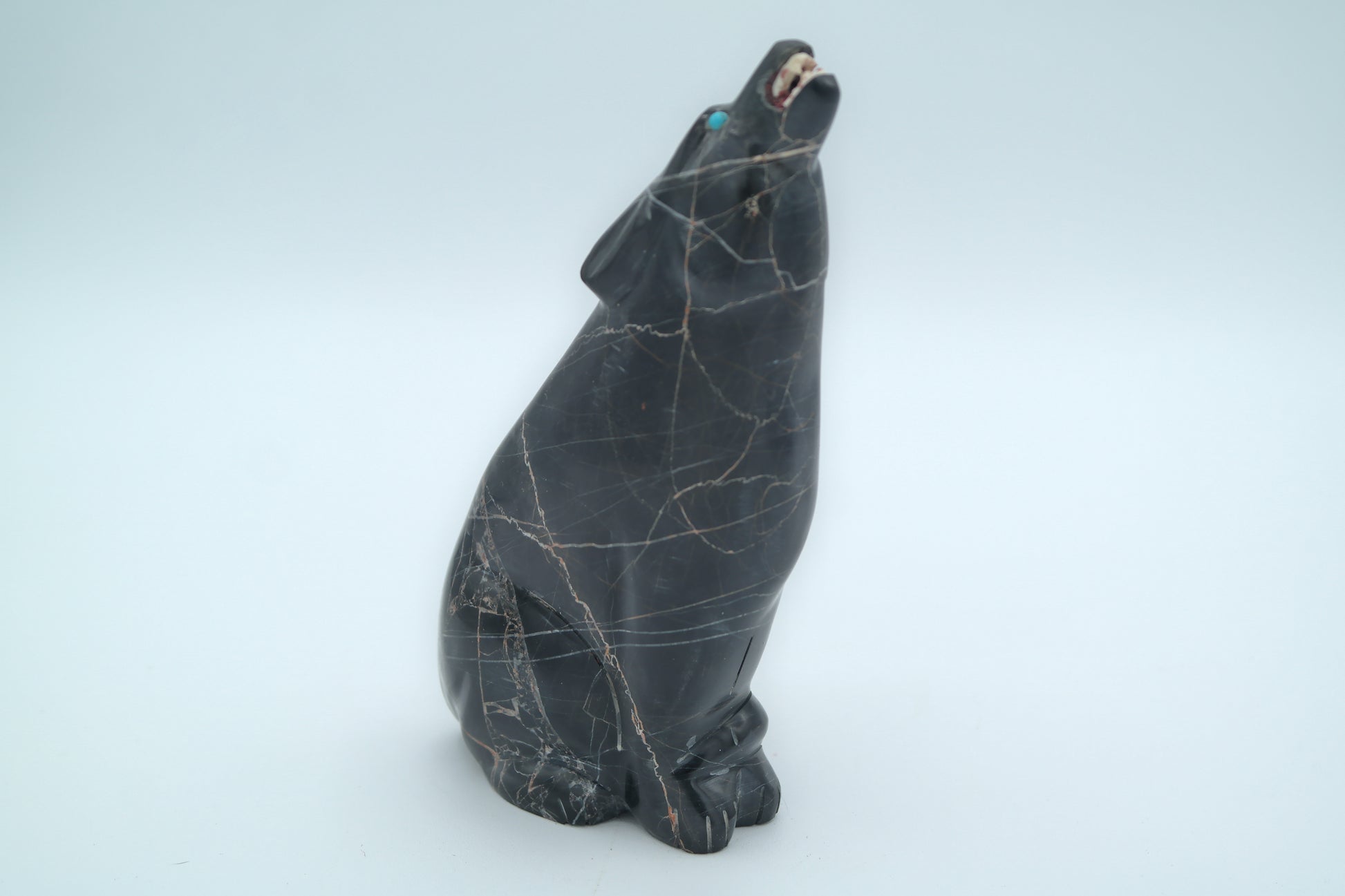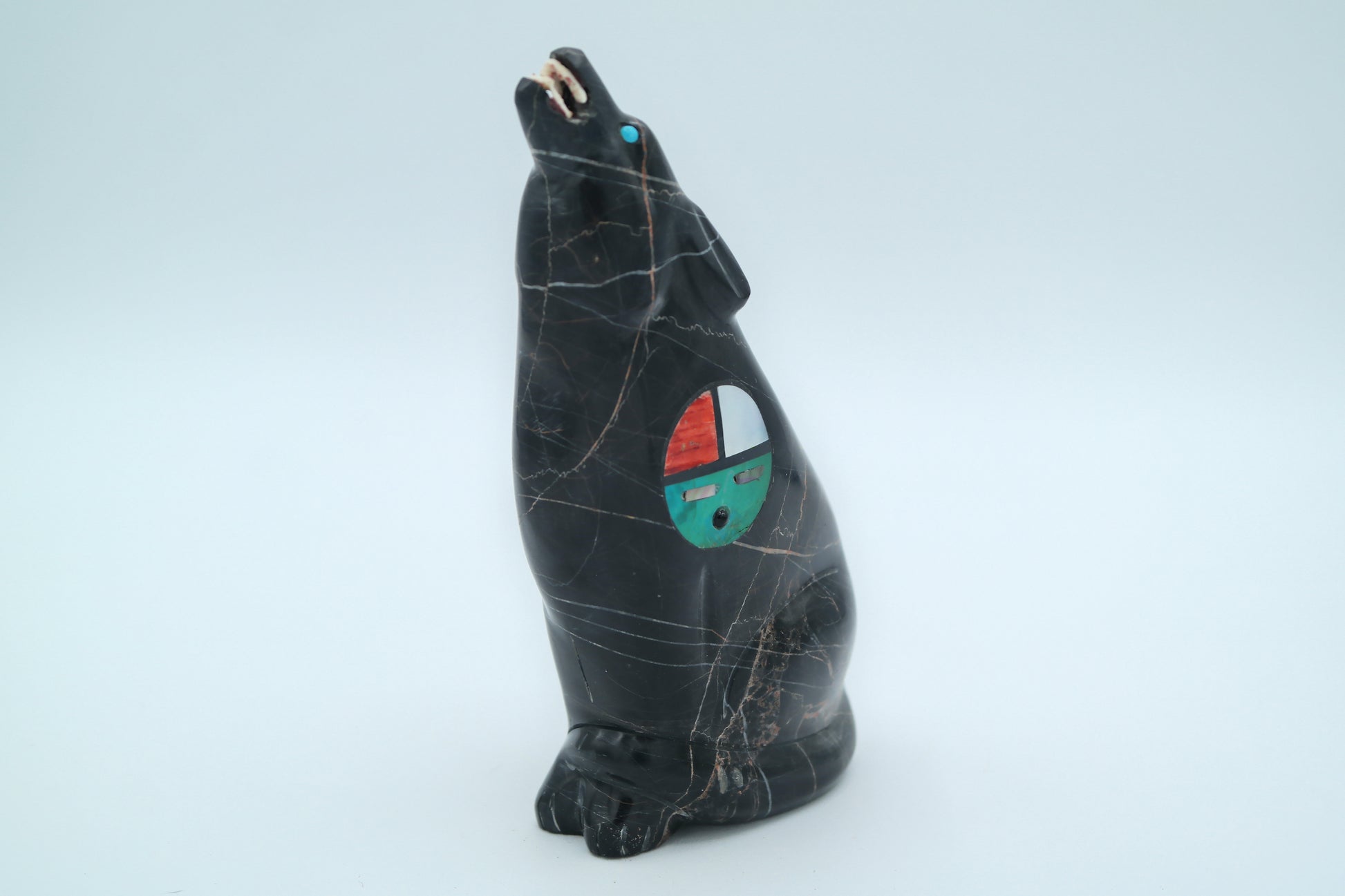 This is a one-of-a-kind, hand-carved carving of an wolf with a beautiful inlay on its side. The inlay's design is the Sunface Kachina face.